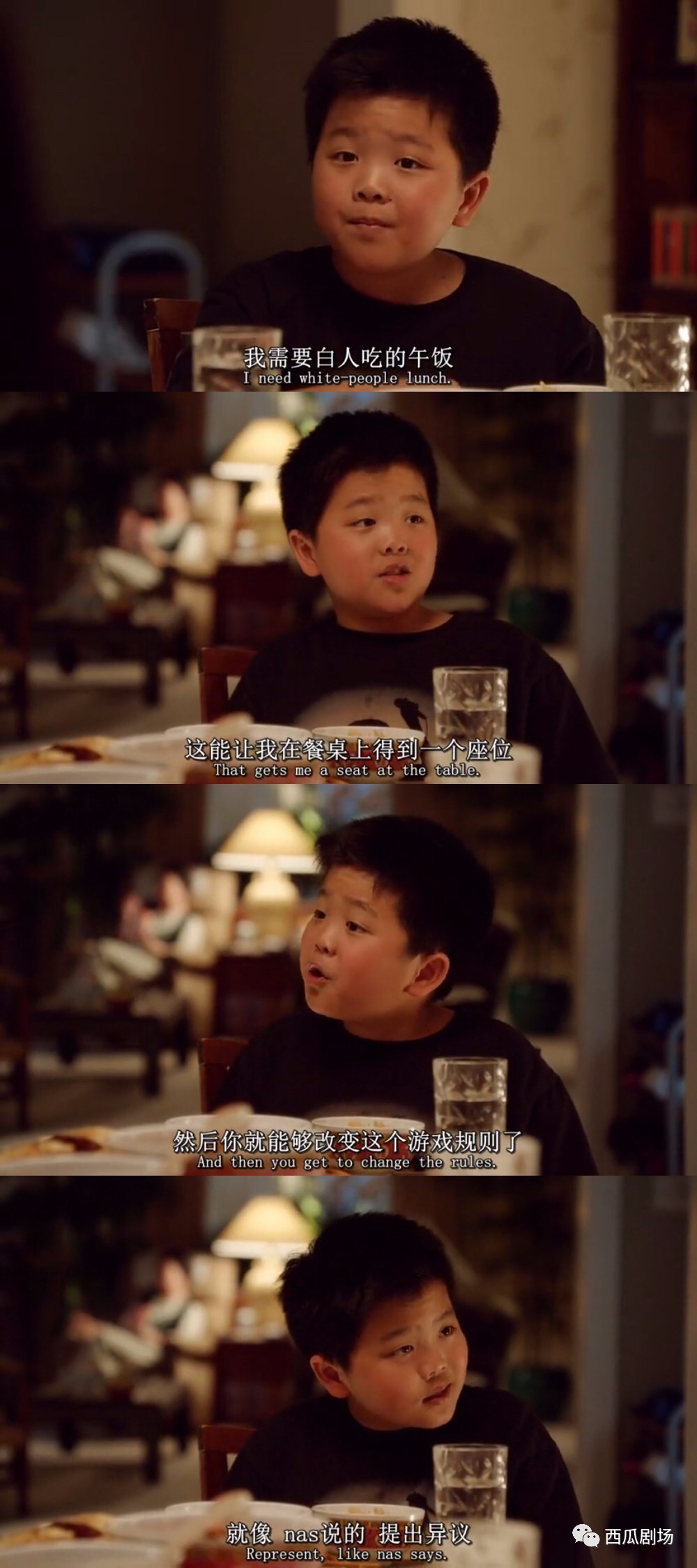 整部剧的基调是搞笑,轻松,又温暖。但却又会因为故事中某位演员的台词引发深思。印象比较深的是第一季第一集eddie在新学校因为妈妈做的中式午餐被排挤,他要求妈妈为他做白人的午餐,要先融入他们,再改变整个社会的规则。