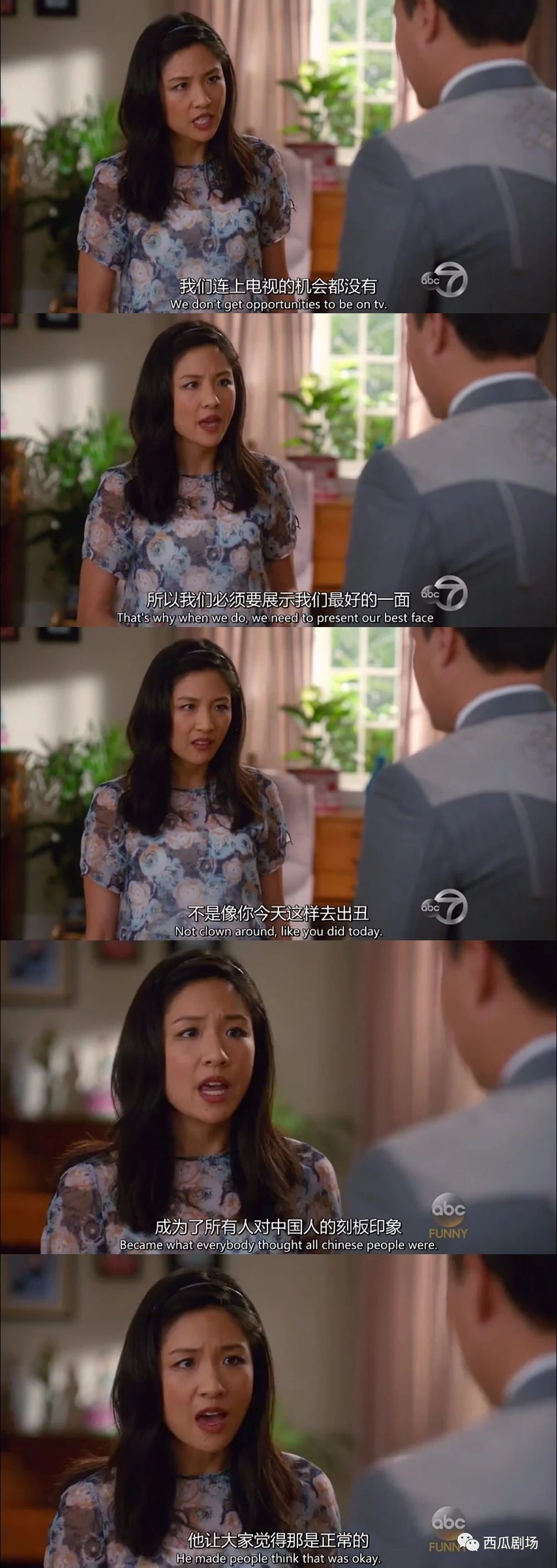 那么如果说,它是亚洲人的一种自嘲,拍给“主流文化”看的。那如果全剧的主题就只有这个,那么这个立场是有点谄媚的。虽然编剧展现了自嘲的能力,但还是被racial stereotype定义了,无法挣脱出这个牢笼。作为一个在美国成长生活的中国人,或者亚洲人,你有话说。可是仅仅是作为一个人,你想说的是什么?这里面没有什么超越种族的东西。”