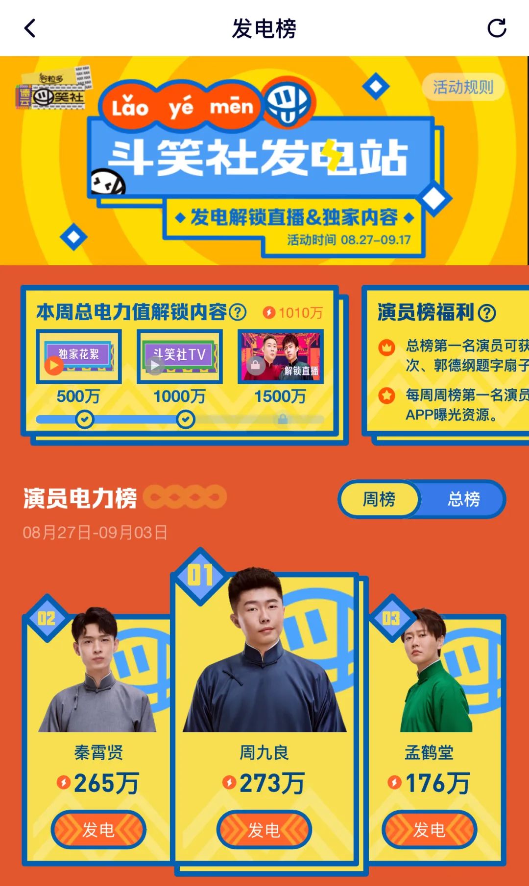 另外,还设有打榜环节,在参加节目的德云男团中可以选择其中之一“为爱发电”,获得榜首的相声演员可以解锁直播、专享镜头版等内容,正片播放时也可以刷礼物。