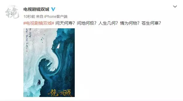 云海荒原,绮梦似花,海报以镜像的概念显现一黑一白两道身影,白璎跳塔,苏摩飞去接住,镜湖漩涡叠起,似乎寓意他们感情坎坷,蓝白相融好像又暗指二人情感变化的融合,云波诡谲的瑰丽图画彰显出华美的东方意境,缱绻深情配上沧月原文中的《九问》: