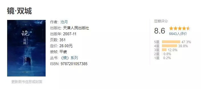 不熟悉沧月的人可能不了解这部小说,《镜·双城》是沧月知名小说《镜》系列的第一部,写这本书时沧月才只有26岁,但这本书带来全新世界观和另类角色人物,完全不像一个20多岁的女孩能写出的见地。该书出版十余年,多次登畅销书榜单,至今在豆瓣仍是8.6的高分,足见其魅力。