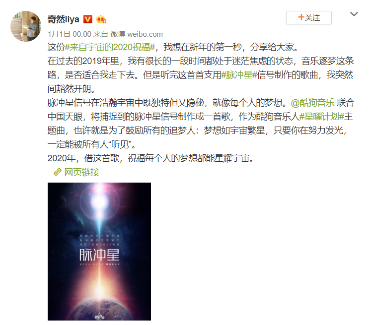 这可能是人类历史上第一首根据脉冲星的信号创作的歌曲,酷狗音乐脑洞大开将中国天眼2017年至2019年新收集到的100颗脉冲星融入到作曲中。歌曲一上线,歌曲评论区就炸锅了,有祈福的,有许愿的,还有科普教育的。各种新媒体平台也出现了一批很有想法的评论。
