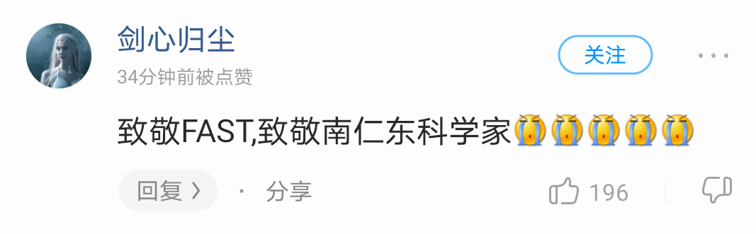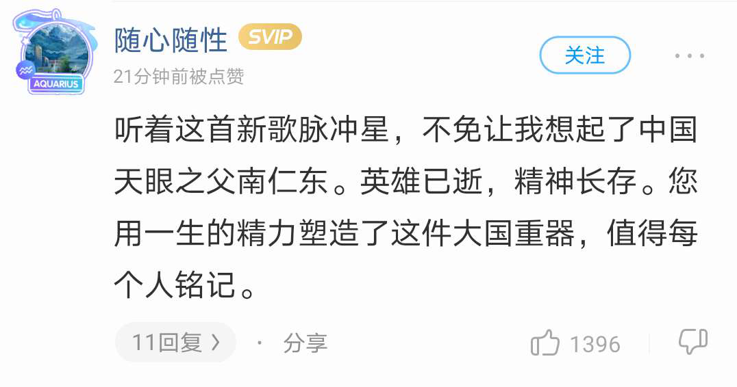 还有致敬中国天眼的评论,这种内容恐怕在其他歌曲下面难以一见吧?这首《脉冲星》,来源于酷狗音乐和中国天眼的一次特别的合作,因此在网友的评论中,许多人向中国天眼及天眼之父南仁东先生致敬,是他们的辛勤奋斗,让中国在天文领域有了长足进步。