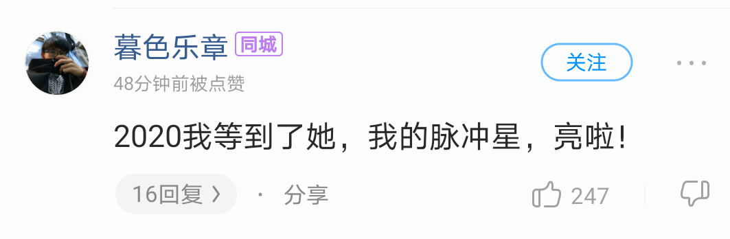 在众多评论中,印象最深刻的是一条独立音乐人的微博。博主是一位迷茫的音乐人,通过《脉冲星》获得了力量,受到了追梦道路上的鼓舞。