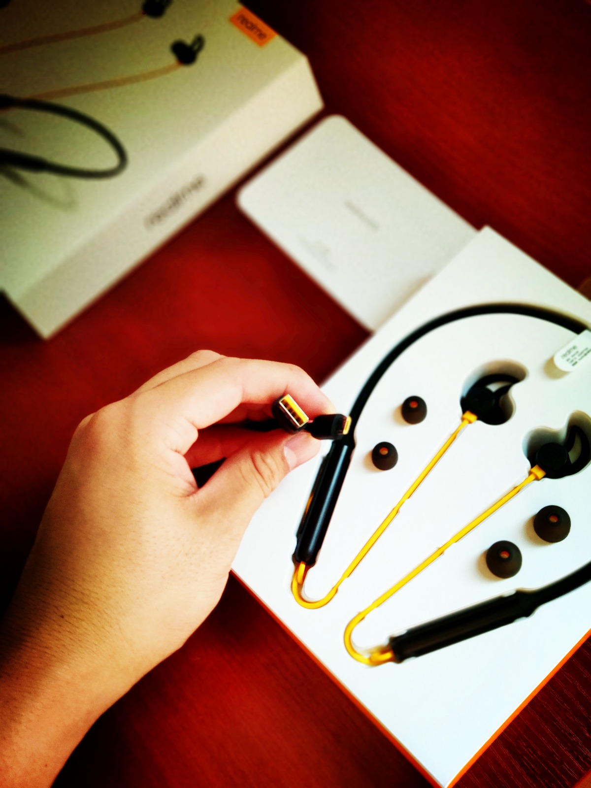 从充电线到大小号的耳塞,realme灵耳都将黑黄配色进行到底了。。。我开始期待其他两款配色了,等发售买来看看。。。。