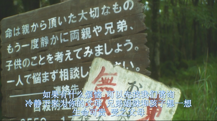 现实中,青木原树海也立着很多警示牌,呼吁游客珍惜生命,不要轻生。
