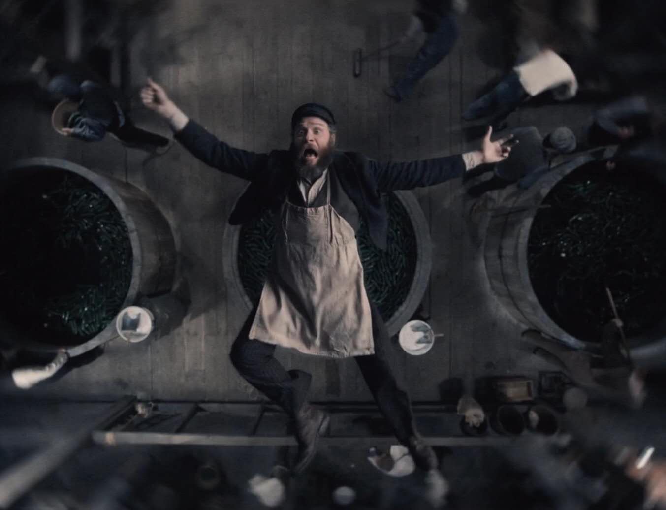 《美国泡菜》整部电影充满了黑色幽默的情节。从人物古板怪异的发音,到荒诞离奇的情节,它更像是一部喜剧,吊足了胃口。