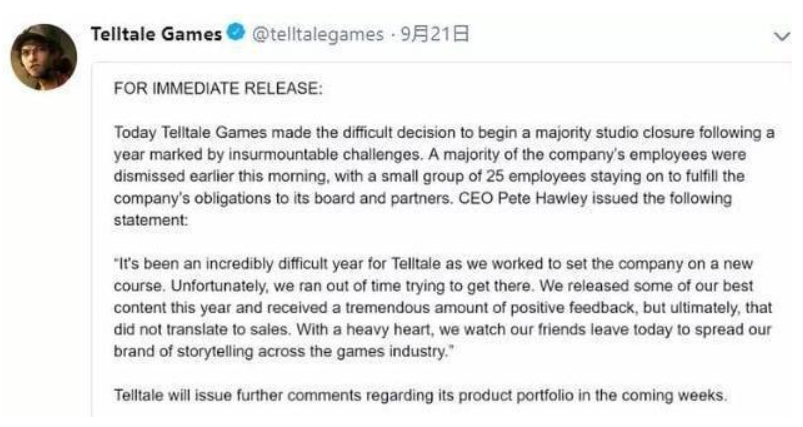 但就是在这么一片欣欣向荣的环境下,2018年9月《行尸走肉:最终季》刚推出了第一章,t社便宣布倒闭,迎来了业界一片震惊。