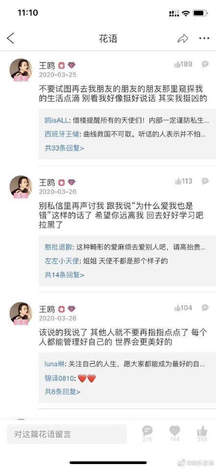 近日演员王鸥大谈“粉丝关系”,其实粉丝真的不要太把自己当回事,不喜欢就别看,别踩。喜欢也不要强制让别人也要喜欢,妄想着明星一定要按照你的意愿过,生而为人,善良一点,都不容易,默默喜欢默默付出也会有人看见的。