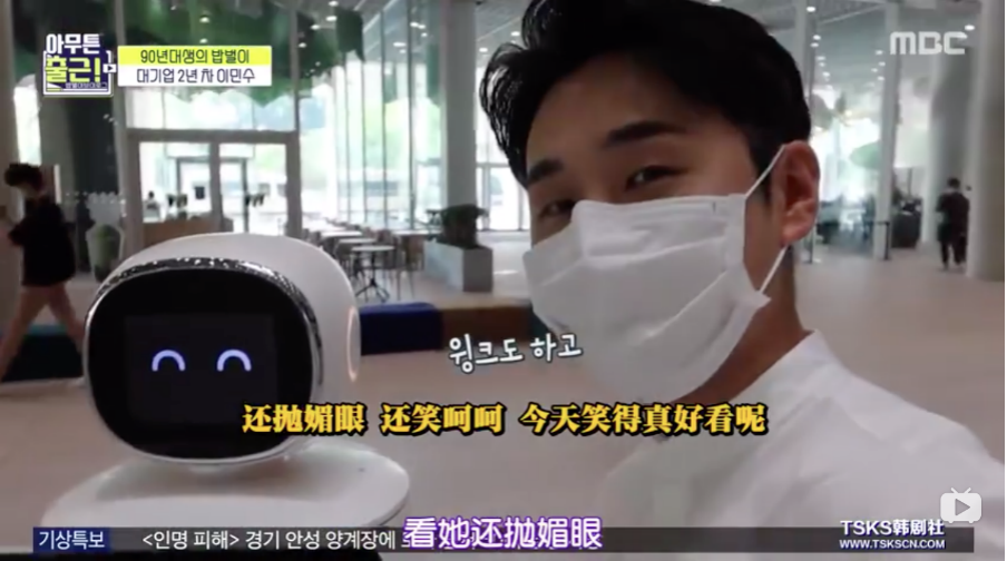 珉苏开朗的性格也和他的工作环境很搭,来到办公室珉苏会和笑眯眯的机器人打招呼。