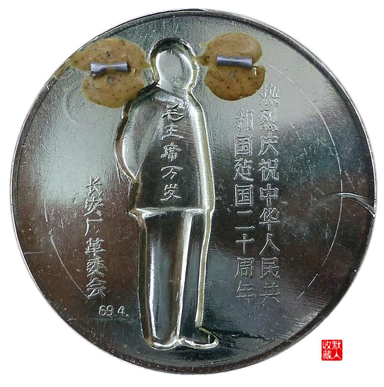 背面铭文为:热烈庆祝中华人民共和国建国二十周年、毛主席万岁、长安厂革委会69.4