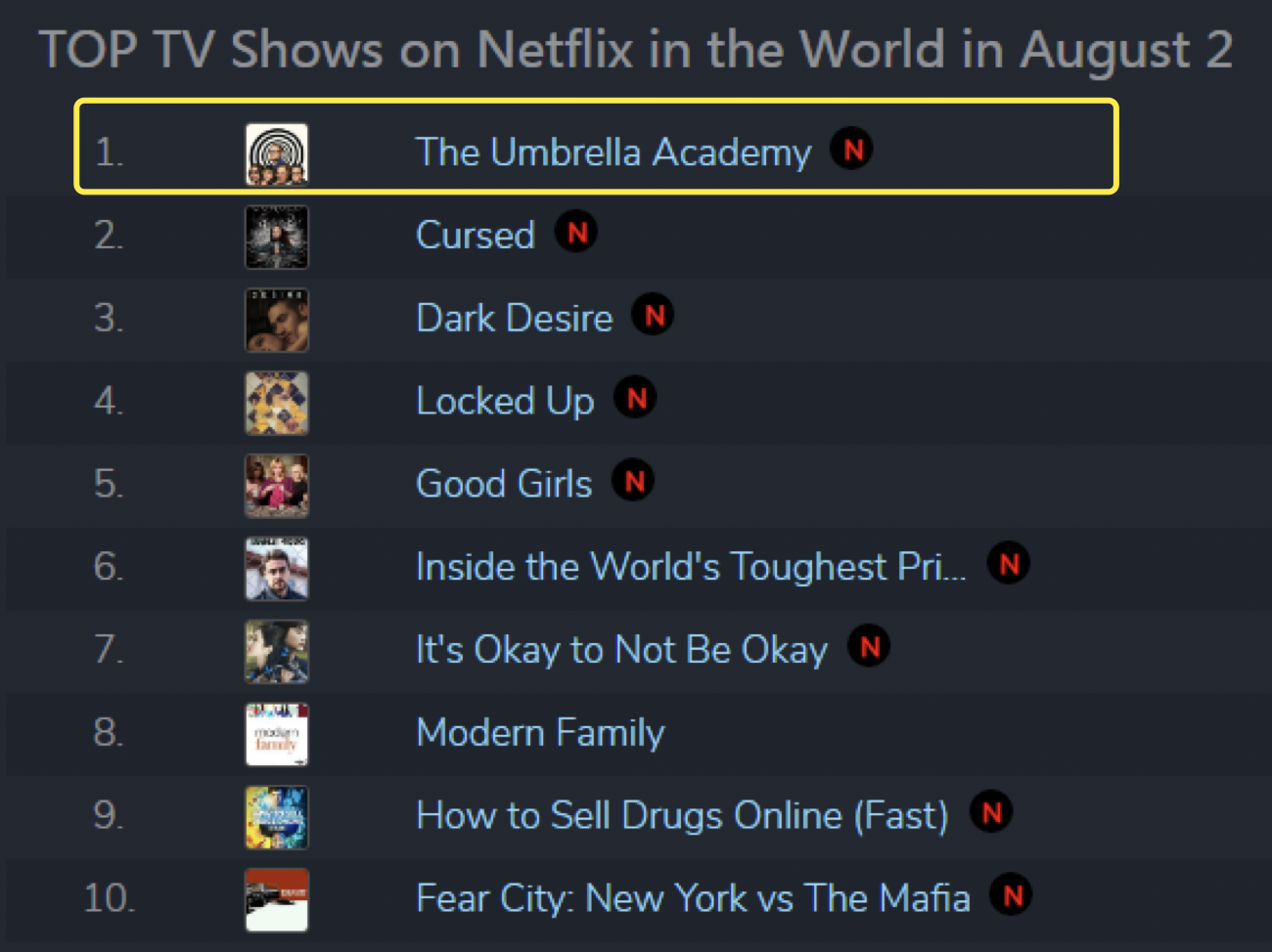 7月31日,《伞学院》第二季正式登陆流媒体巨头netflix,并一次放出全部十集,刚开播就获得了netflix全球39个国家和地区热门剧集第一名、烂番茄新鲜度达92%、荣登烂番茄最受欢迎剧集榜单榜首,同时imdb分集评也分持续走高,大结局更高达9.4,就连豆瓣评分都到达了8.1。