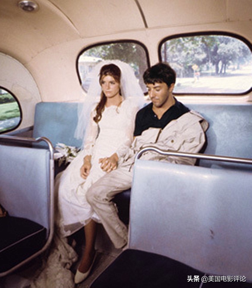 具有讽刺意味的是,本杰明最终并没有真正融入到虚伪的“塑料”社会,只有在伊莱恩所在的校园,他才恢复了自己的方向感。他步步紧逼的追求无疑将自己和罗宾逊太太的罪孽强加给了伊莱恩,求爱过程是那么残忍和无情,更为让人难以接受的是他冲入婚礼的殿堂,在众目睽睽之下抢走了披着婚纱的新娘伊莱恩,导演了“落跑新娘”的戏份,在欢笑过后,二人呆坐在公共汽车的后排,面对众叛亲离和虚假的社会,他们的前途并不明朗,他们的婚姻仍然是茫然没有明确的归宿,他们的幸福充满了变数。