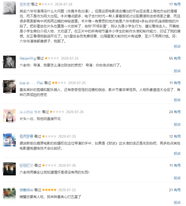网友1:其实六爷爷演得没什么大问题(毕竟本色出演)。但是这部电影适合播出的平台应该是上海地方台的滑稽戏,而不是作为网大出现。本片槽点颇多,电子支付时代一帮人拿着报纸讨论股票堪称迷惑场面之最,而且很多画面都有中间亮两边暗的神秘遮罩。