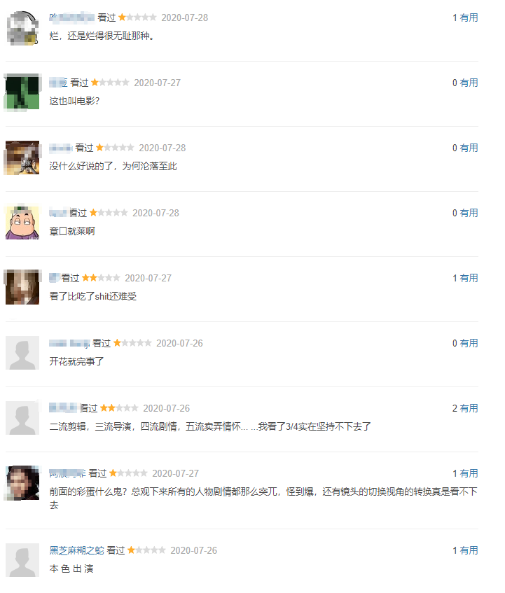 而在豆瓣,也是清一色的一星差评致敬六老师!我只能说由于疫情没能院线上映转而线上播放也许是这部电影最好的结局,不然一定是口碑崩塌至于连带着票房也刚够剧组盒饭钱。