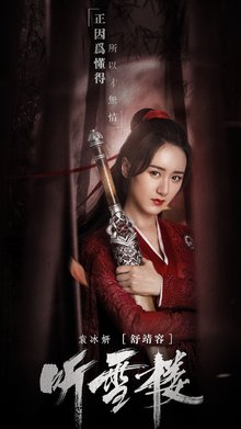 舒靖容(袁冰妍 ),“血魔之女”。8岁时,父亲自杀身亡,后拜师白帝,师兄是青岚,两人青梅竹马,这个青岚很重要。一会儿再细说。舒靖容也叫阿婧,由于从小成为孤儿,性格多疑,不相信任何人。武器是“血薇”,此剑妨主,凡持此剑者皆无善终。阿靖的武力值比萧忆情稍差一点,排第二。两人联手将听雪楼发展壮大,但是人们都在猜测二人会成为情侣,可他们却始终只是搭档。阿靖对于萧忆情的爱意总是拒绝。原因和青岚有关。袁冰妍上一部比较出彩的是《将夜》中的莫山山,这个角色让她人气大涨。