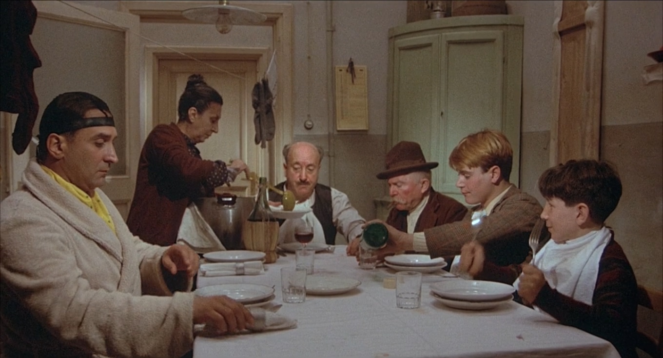 人物出场之后,紧接着就是故事。费里尼在《阿玛柯德》中给我们展示出了一种有别于传统意义上的人际关系,老师和学生之间的滑稽关系,疯子沃皮娜和男人之间暧昧的关系,工地的民工和工头之间玩笑般的关系。接下来,费里尼的摄影机来到了他的家庭生活。父亲和母亲的争吵、老少三代的关系还有偶有的较真和争吵,一切都是如此真实。尤其是当“母亲”去世后,父亲的沉默更显凄凉。