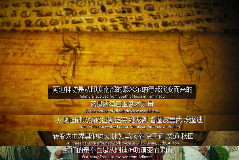 为了烘托出阿迪神功有多威猛,影片特地通过一个所谓的泰拳宗师,来对其进行吹捧,说它是所有武术之母,来自南部的泰米尔纳德邦,演化出包括泰拳在内的多种武术。(有趣的是,没提中国功夫)