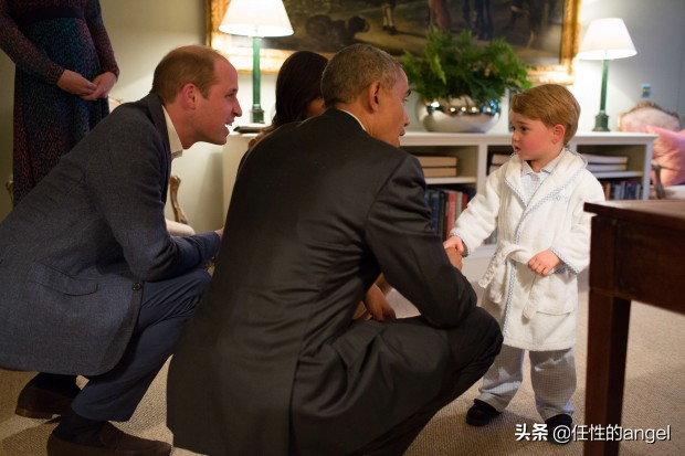 很多人想见到奥巴马,但没想过穿着睡袍见他。2016年4月在肯辛顿宫,两岁的乔治主动上前,与奥巴马握手,在时任美国总统面前显得落落大方。后来乔治一直待屋里,骑着他的小摇马,然后去睡觉。