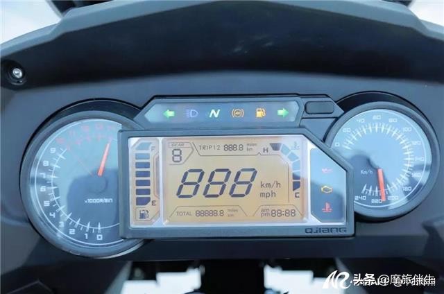 细节2描述:新款黄龙600至尊巡航版的仪表有了大改动,增加了一个大的数字液晶仪表,显示信息全面,并在两边保留了传统指针式的转速表和时速表,这点赞一下,相信有不少车友跟小编一样依然有指针仪表的情节,不过在液晶仪表的右下方打上了钱江的logo,感觉有点怪怪的。另外要说的一点是十分喜欢在车身各部位大logo的贝纳利,在油箱上面就有三处logo,却放过了仪表上方这么大一块区域,中央没有logo感觉有点空,后期贴纸解决吧。两边的装饰板粗看第一眼我也以为会是音响,被无情打脸。
