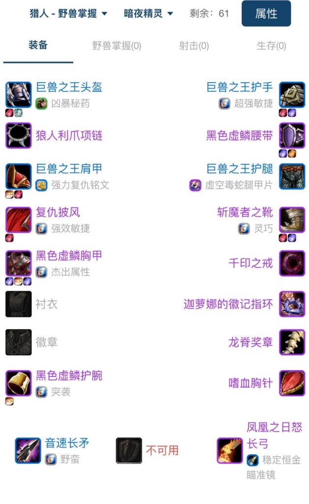 之后的提升就可以按部就班了,买个裁缝制作的复仇披风,慢慢收集龙鳞三件套的材料,攒下牌子先换个嗜血胸针,其他装备除了龙脊都在卡拉赞提升了。而卡拉赞的三把远程武器由于武器本身dps提升很大,足以弥补攻速的不足,所以都可以换掉天火鹰弓了。
