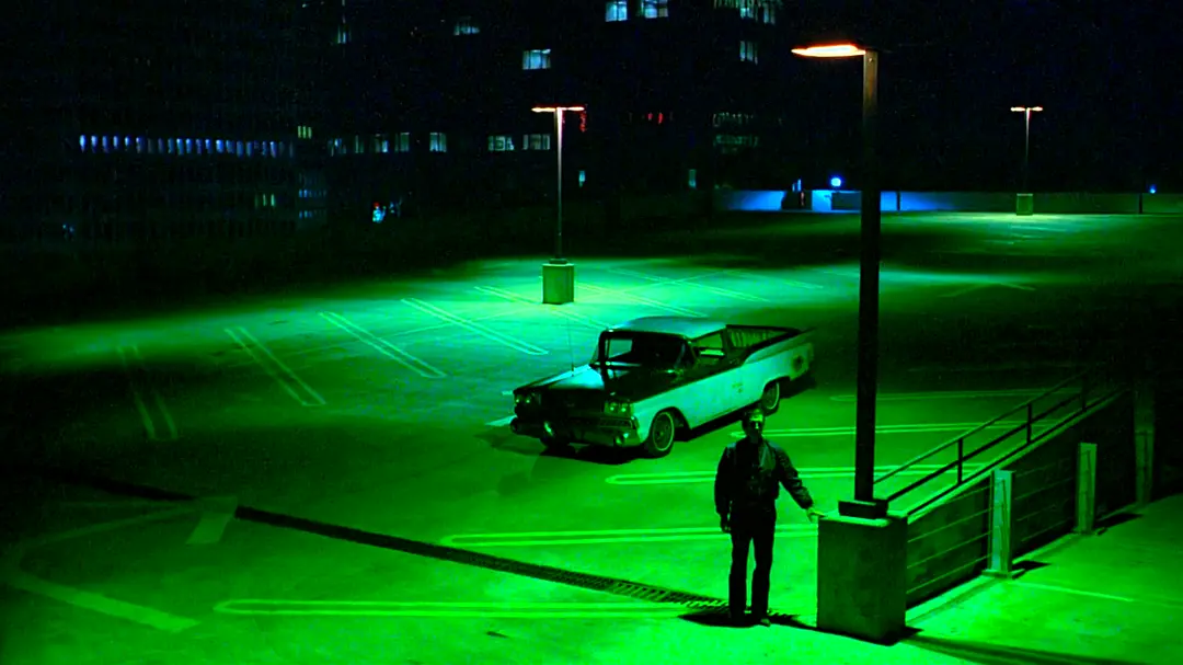 暗绿色画面中的街景、灯光、人物、汽车,在电影最后反复出现,把人的孤独感渲染得淋漓尽致。