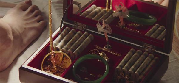 老张一往情深,阿娇却是逢场作戏,只想着用首饰和金钱装满自己的梳妆箱(让我想到杜十娘的百宝箱)。
