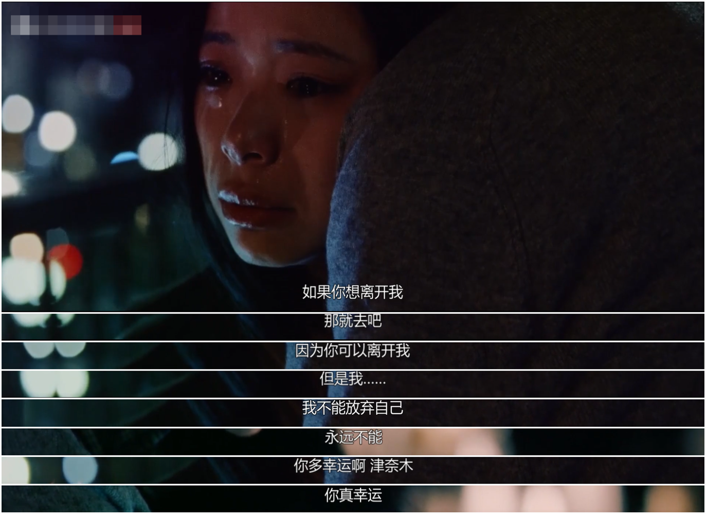 我们这辈子都不可能离开一个人,那就是自己,与其说宁子想通过津奈木的了解而得到认可,倒不如说,宁子想要与并不那么好的自己和解,与有些累赘的自己和解。