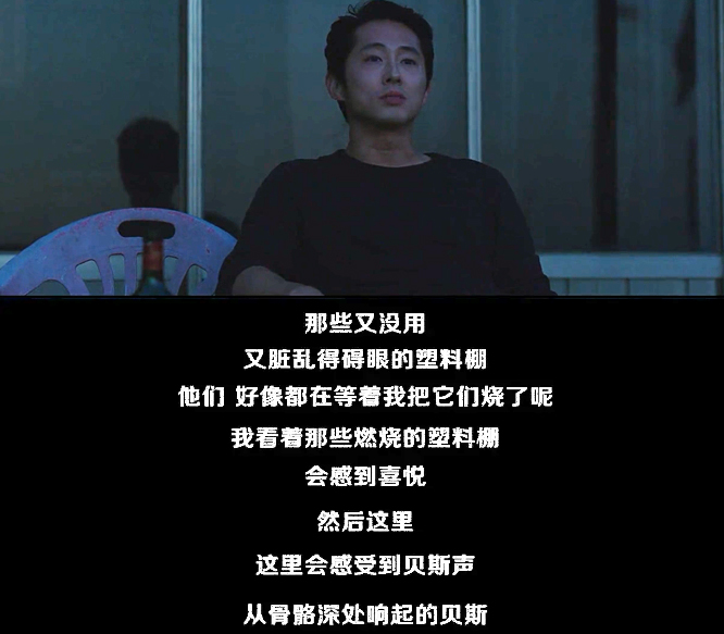 本对钟秀透露了他的癖好,他喜欢烧塑料棚。本说:那些又没用,又脏乱得碍眼的塑料棚,它们好像都在等着我把它们烧了呢。我看着那些燃烧的塑料棚会感到喜悦,然后这里会感受到贝斯声,从骨骼深处响起的贝斯。