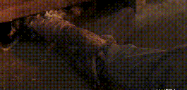 他循着飞鸟来的方向,找到一个破旧的铁门,蹲下身子往里看却啥都没有,正当他准备离开,一只长满毛的黑手从门缝伸出,抓住了黄毛的脚踝,黄毛吓得屁滚尿流,飞快地逃走了