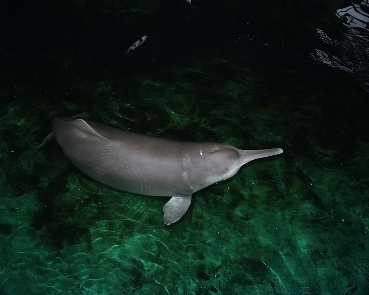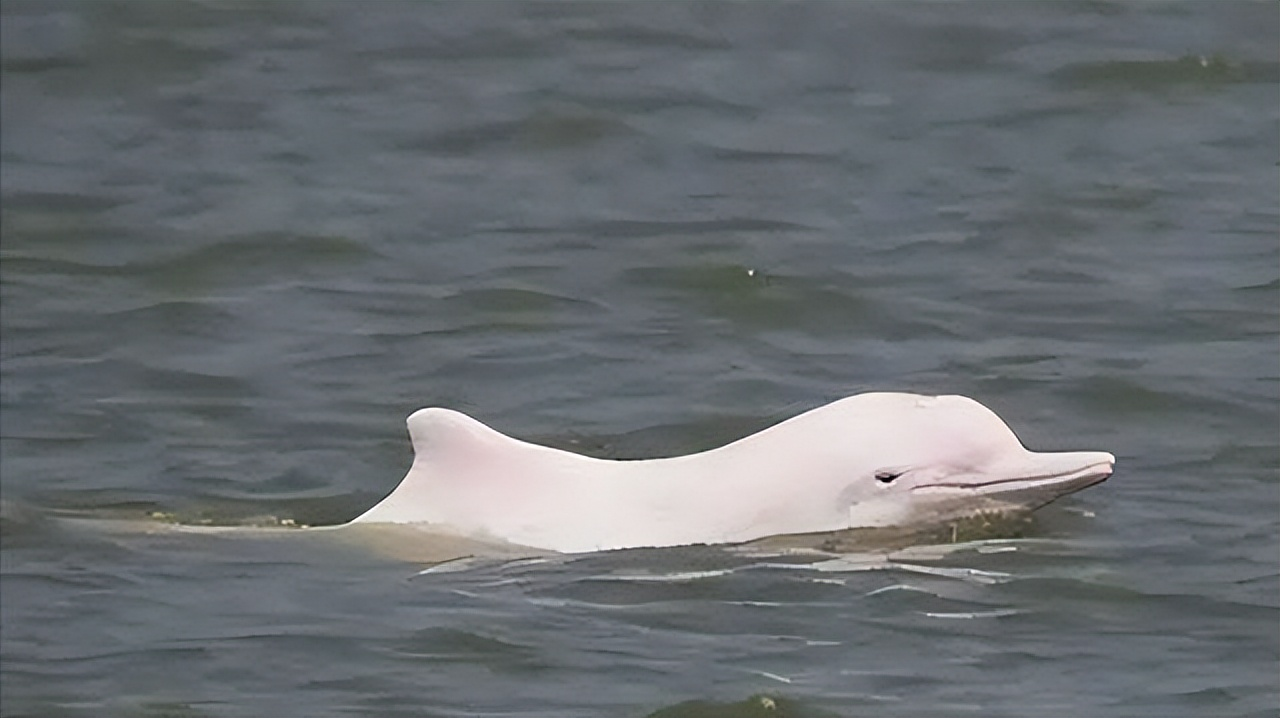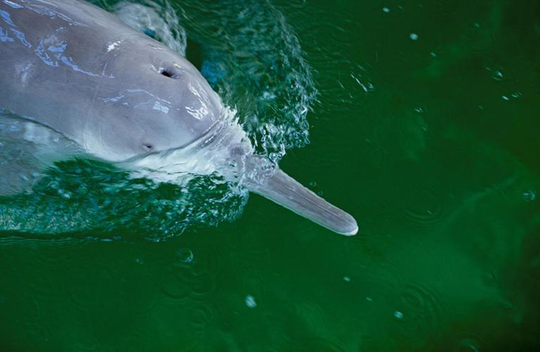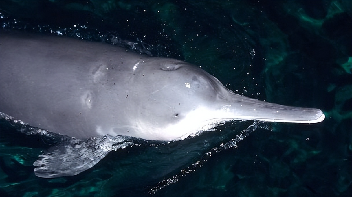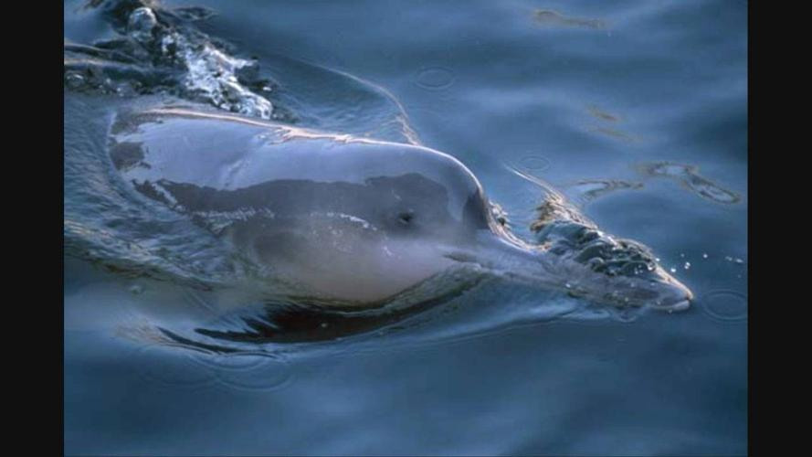 腹部则呈现纯白色,形成鲜明的颜色对比。这种独特的色彩分布使白鱀豚在水中游动时能够在不同水深中融入周围环境,从而在捕食和逃避捕食者时具备优势。