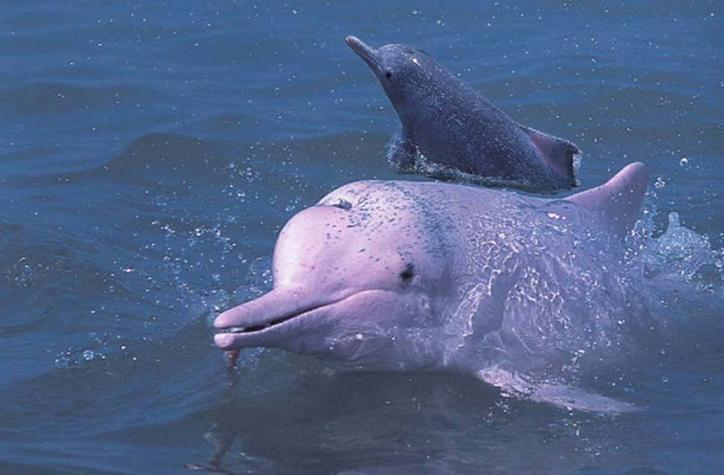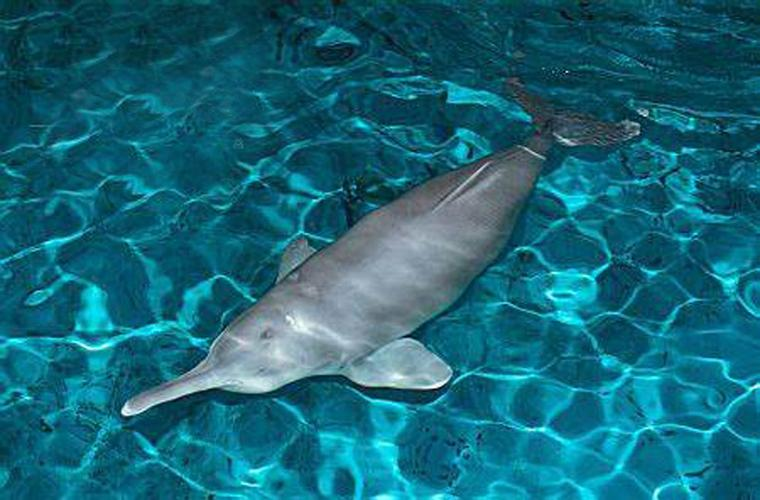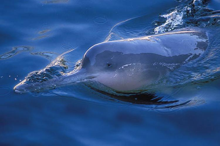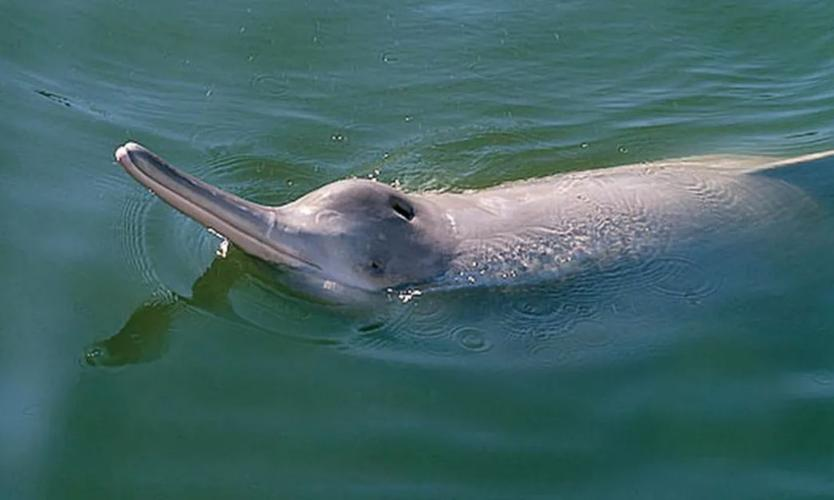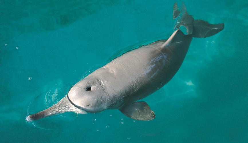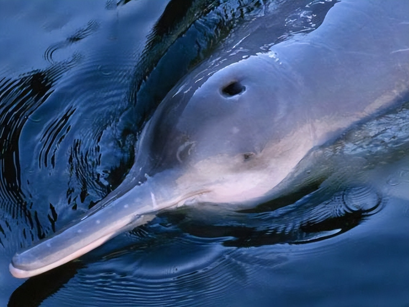 腹部则呈现纯白色,形成鲜明的颜色对比。这种独特的色彩分布使白鱀豚在水中游动时能够在不同水深中融入周围环境,从而在捕食和逃避捕食者时具备优势。