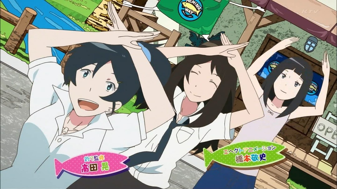 围绕着这样一个画风奇特的4人组,一眼即能看出会组成一条有关成长的线索,讲一段治愈的历险记,官方给出这样的标语,“钓鱼×高校生×宇宙人=青春!?”。尽管《钓球》已经明摆着告诉观众“我就是在讲青春”,然而叙述角度还是让人眼前一亮。切入点选择了一项在日本老少咸宜的活动——钓鱼,4人组的日常活动就是从钓鱼小白到高手为主线,还暗藏江之岛的传说为辅线。讲述故事的方法也像是钓鱼一样,从一开始就不断抛出一个接一个的诱饵,外星人春为什么会爱钓鱼,雪的奶奶自立那么多flag到底会不会倒,迷之印度人到底要干什么……有头有尾,有伏笔有高潮,设定极其清奇,串联起来还是有层次有逻辑,即便到最后会发现几个年轻人钓着鱼居然都能够拯救地球,也觉得似乎合情合理。如果不是一口气看完,想必每集结束都会被吊胃口到抓心挠腮。