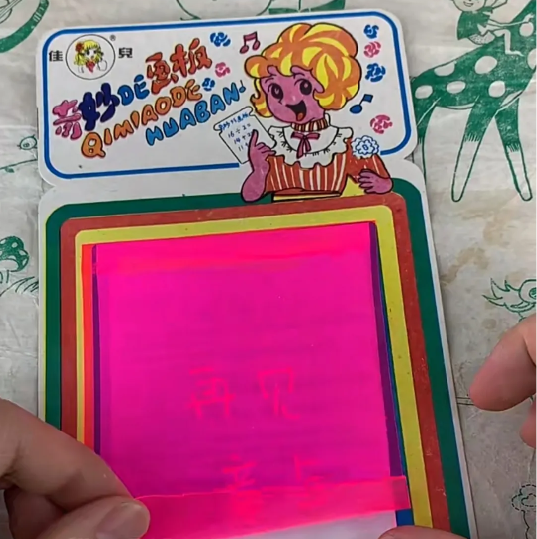 这种画板的奇妙之处就是可以在上面写字,而写完之后将红色塑料皮掀起来字就没了,与现在孩子用的荧光笔画板很像,可以说是荧光笔画板的平价替代了。