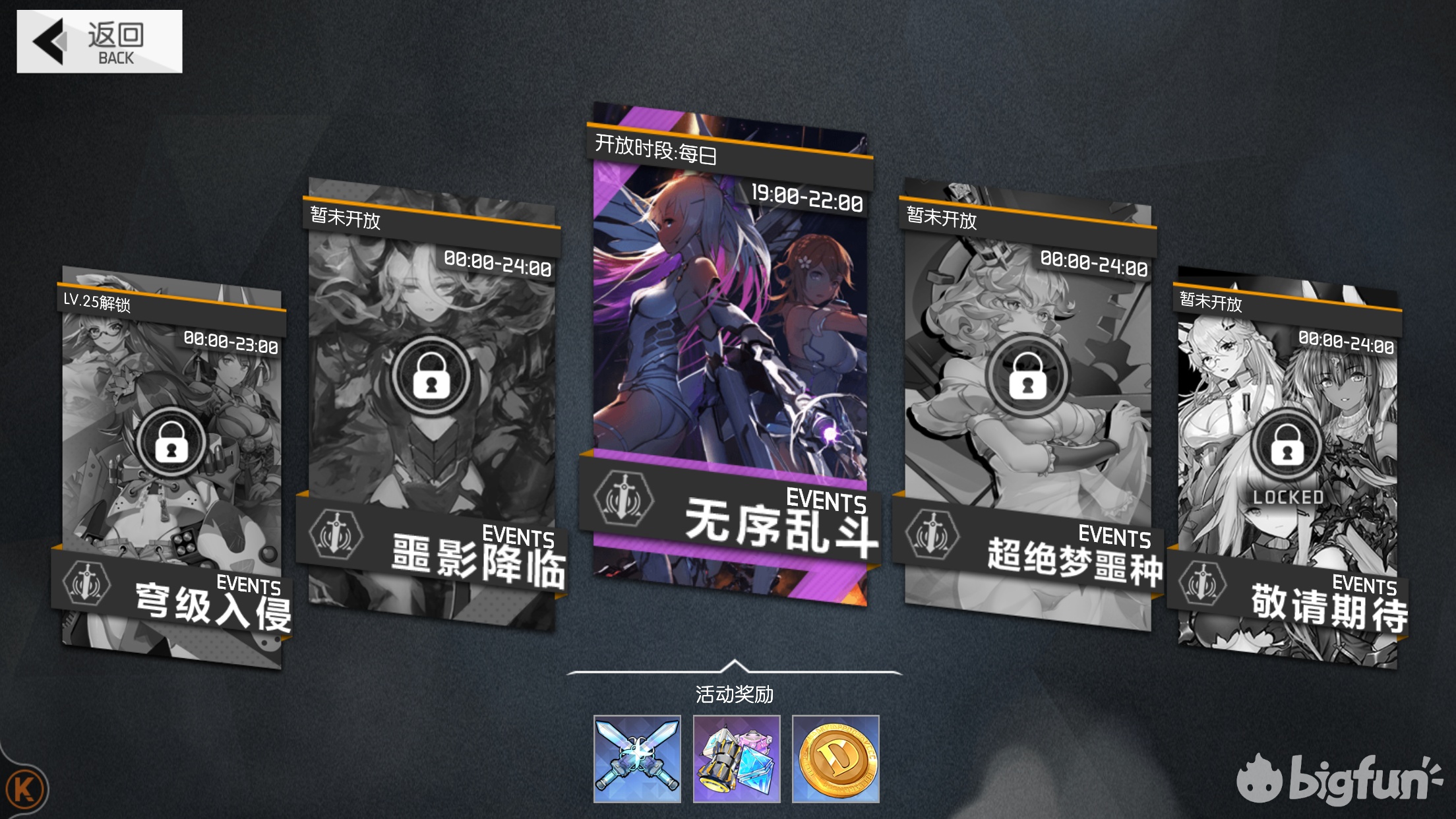 - 第四个是活动关卡,在主界面的ui里有。是获取商店兑换点数等其他掉落物品的关卡,且开放时间有一定限制。
