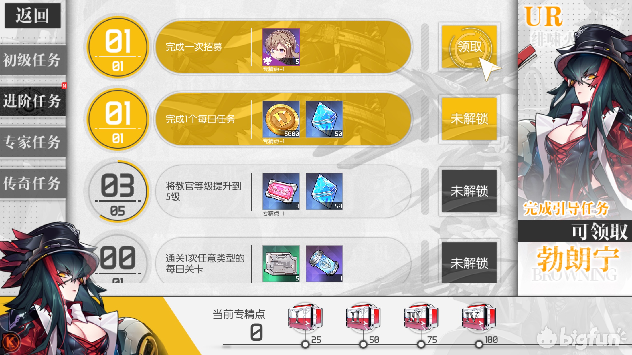 - 游戏任务分为两大部分,第一部分是新手引导任务。新手引导任务分为:初级,进阶,专家,传奇四个等级,完成任务会获得相应专精点,达到100专精点可以获得ur角色勃朗宁,其任务完成后本身的奖励也颇为可观,有些任务完成后会直接送招募核心。勃朗宁的主动技能是个自带跟踪的aoe技能,十分厉害(笔者抽到了,已放在队伍里当主力)
