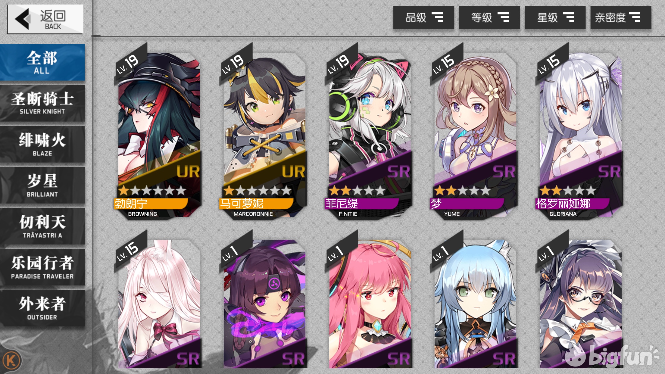 - 突破,达到一定等级且获得足够材料后,突破角色星级。角色在突破星级后会获得属性全方位的强化,且突破需要的角色碎片可以通过完成任务获得的精粹来兑换,意思就是,不需要氪金只要够肝也可以提升人物星级,一个ur角色碎片需要300精粹,ur角色从一星升级到二星需要十个角色碎片并达到15级。