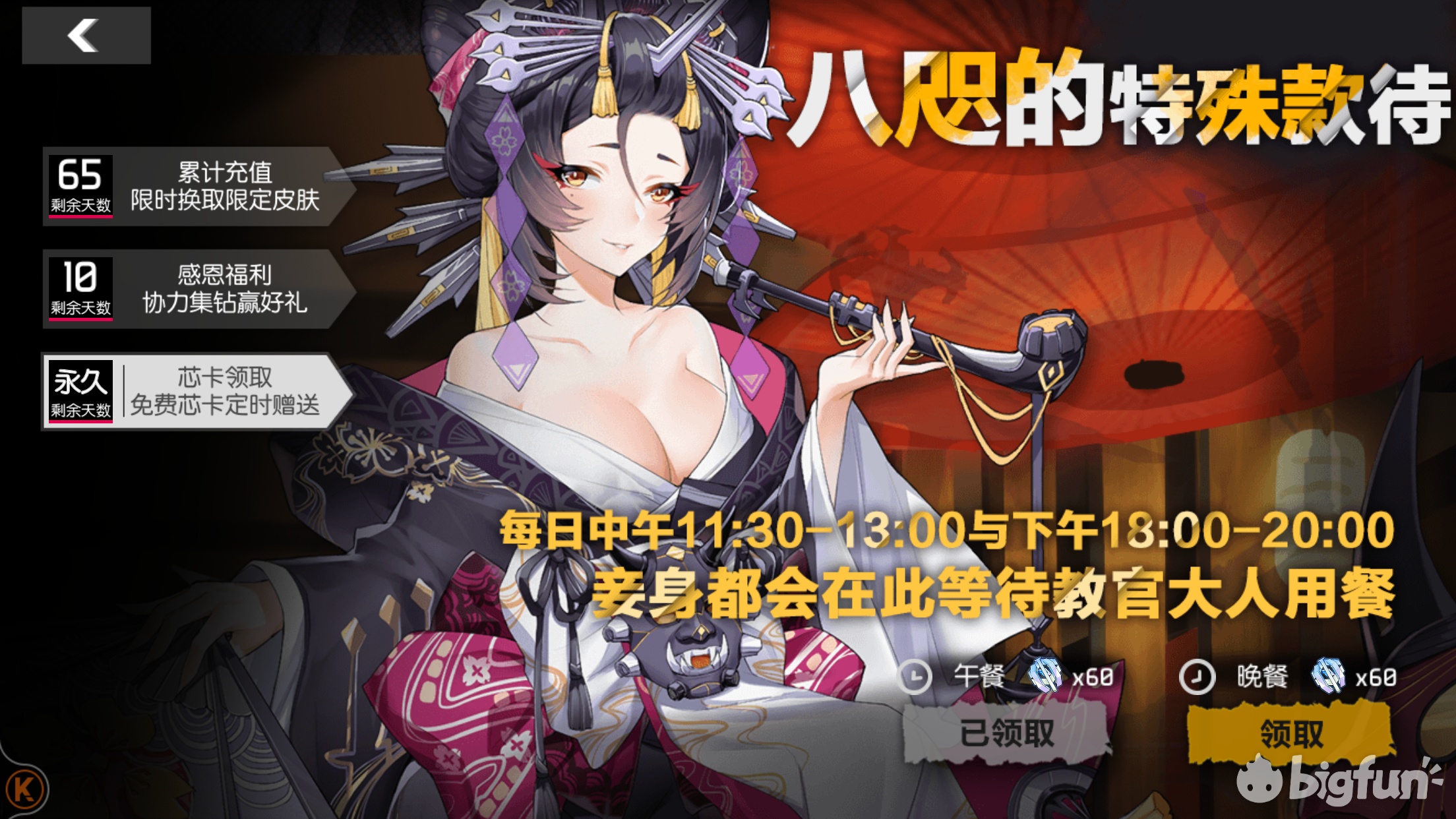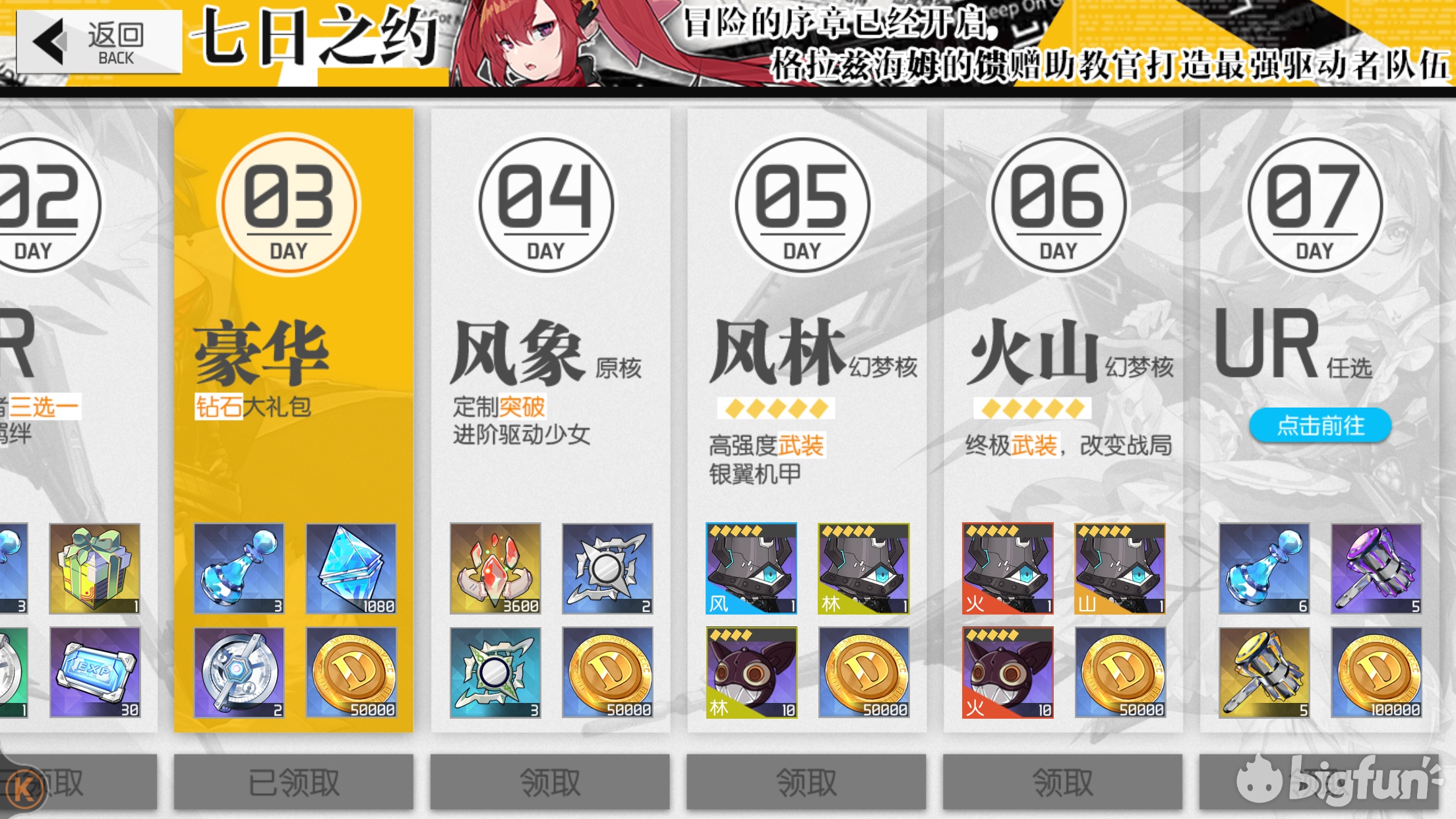 - 第三个是七日之约,就是七天签到活动,第七天会有三个ur角色让你任选一个。该游戏ur角色的强度普标都比较高,没有说活动给的ur都是垃圾ur(何况三选一还有一个是白发,白发控狂喜)