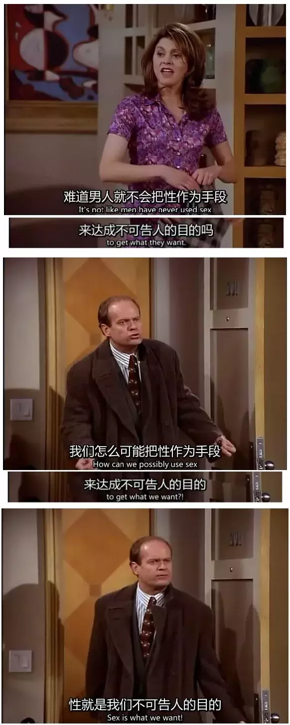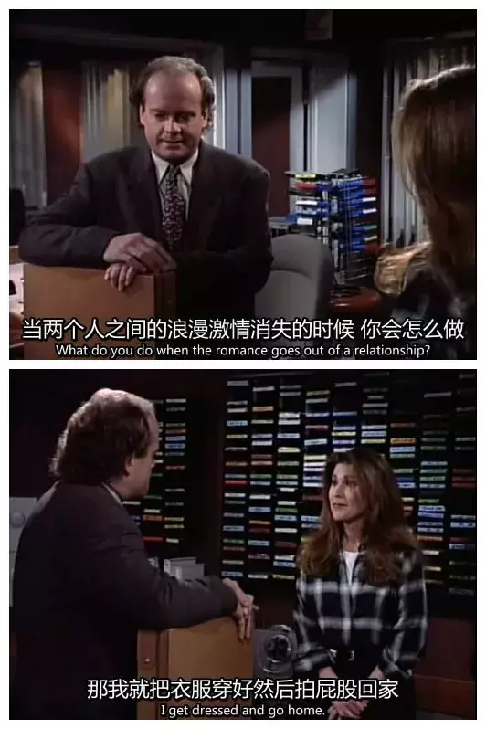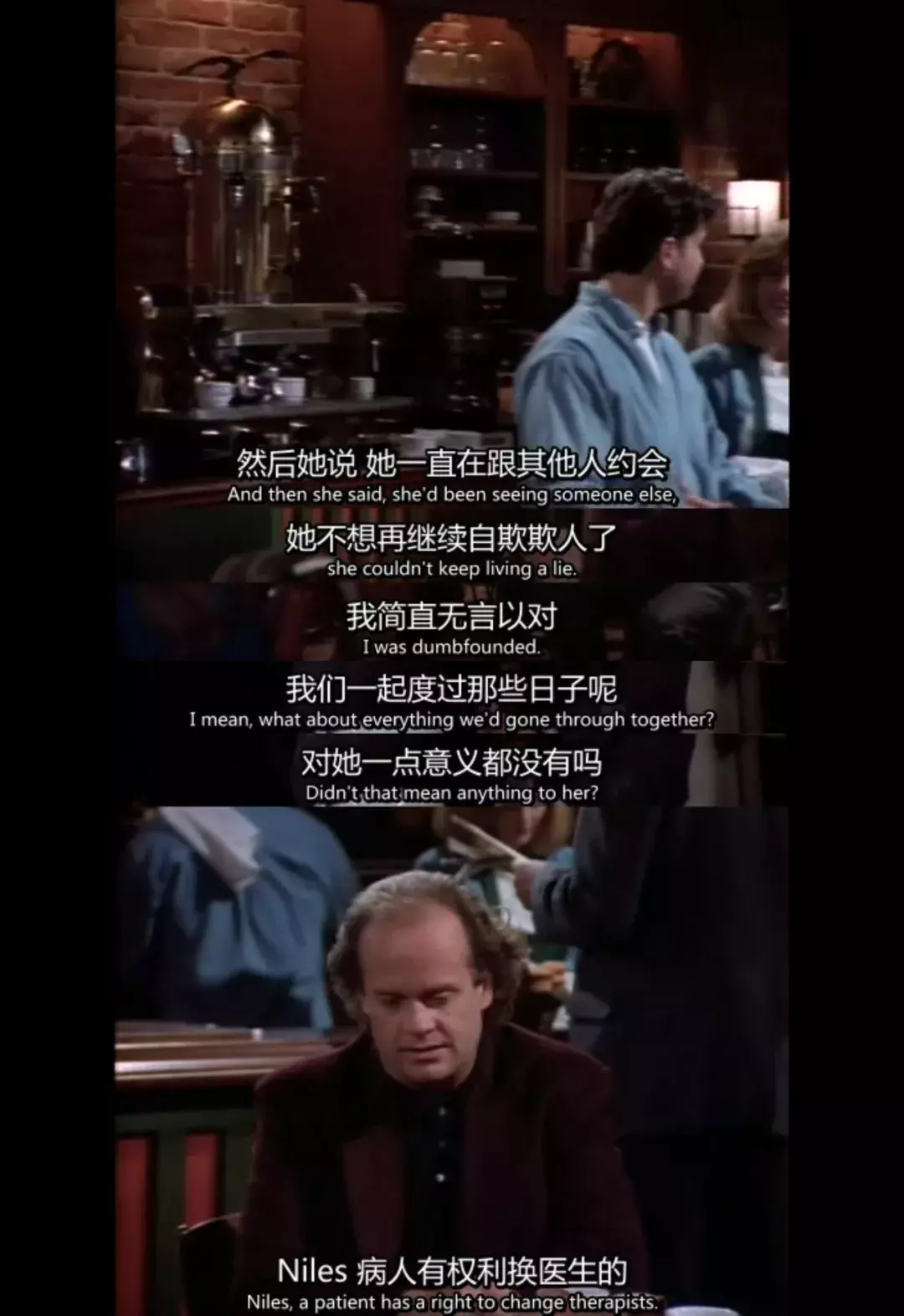 达芙妮问弗雷泽,为什么家人之间总是相爱容易相处难。弗雷泽回答说,因为这样我们的人生才更加多姿多彩,而心理医生的收入才能更加“精彩”。