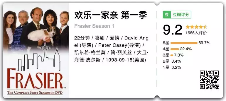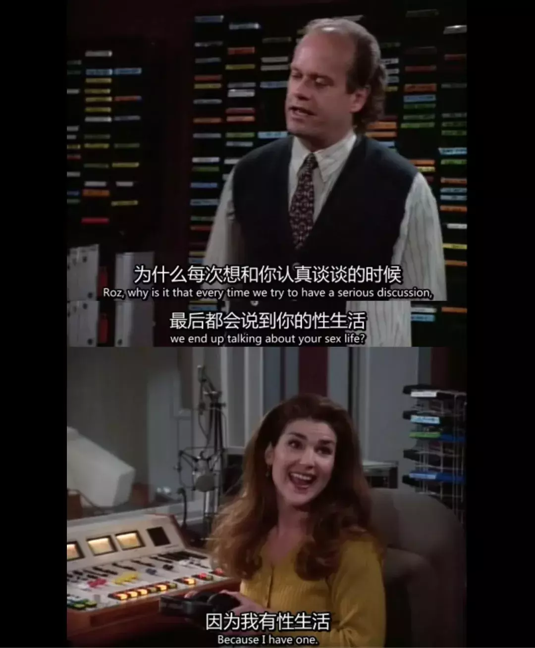 就主演和观众的年龄层来说,《欢乐一家亲》是不折不扣的成年人喜剧。跟新世代的成人喜剧不一样,《欢乐一家亲》264集的剧集里,没有出现过一次f开头的粗口,最过分的也不过是弗雷泽的同事、“炮王”bulldog(丹·巴特勒 饰)的口头禅"bullshit"。