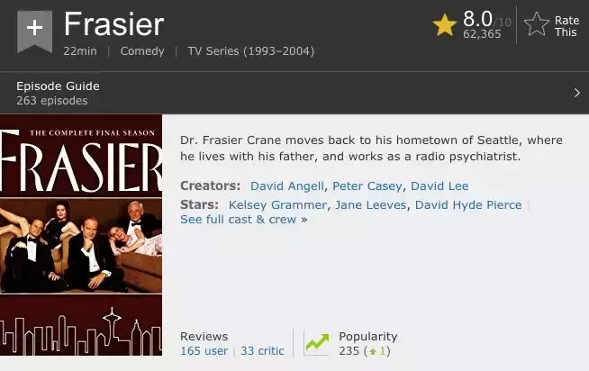 《欢乐一家亲》中的的弗雷泽。凯尔希·格兰莫的嗓音真是没得挑,《欢乐一家亲》的片尾曲就是他唱的,他还凭借为《辛普森一家》中的sideshow bob配音拿过艾美奖。