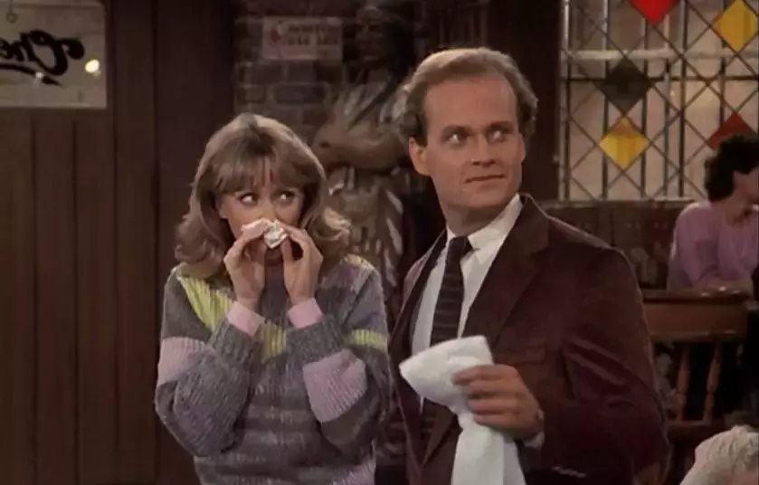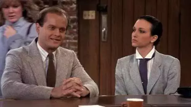 弗雷泽还在《干杯酒吧》(上图)中认识了另一位心理医生莉莉斯(比比·诺维尔什 饰),两人在剧中结婚生子。到了《欢乐一家亲》中,他们已经离婚,但个性独特的莉莉斯依然是《欢乐一家亲》最受欢迎的客串角色之一。