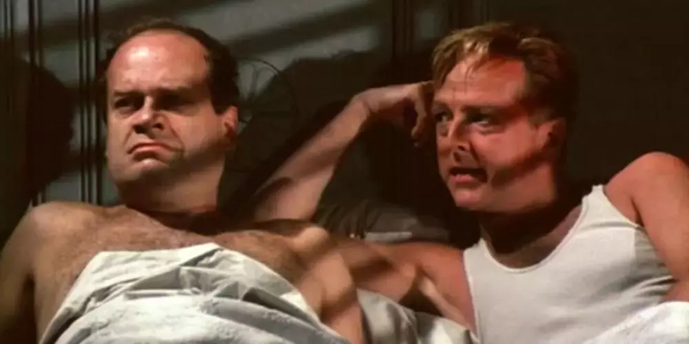 直男弗雷泽很受同志们的欢迎,其中一集,他甚至做梦梦见与全世界都知道他是gay的吉尔(右)同床共枕。插播一句,饰演bulldog的丹·巴特勒与饰演奈尔斯的大卫·海德·皮尔斯本人都是同志,一直勇敢为lgbt群体发声。