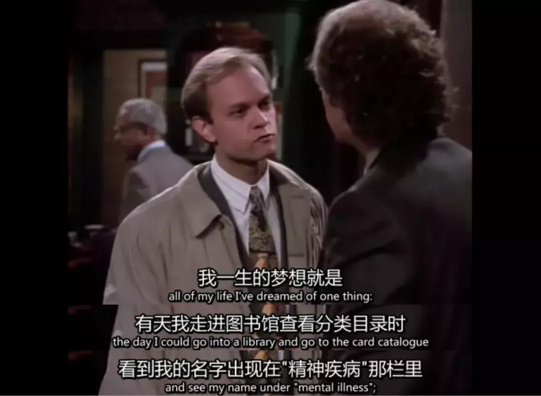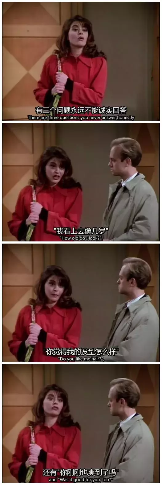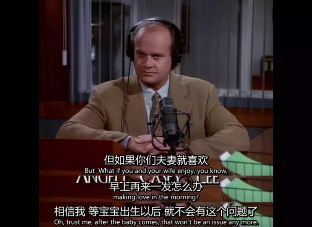 《欢乐一家亲》对于对白的雕琢不仅符合角色和剧情的设定,也让整部剧的的英语词汇难度一下子提升了不少。弗雷泽和奈尔斯都是心理医生,平日里本就爱卖弄学问,长篇大论,超长句子讲起来都没有在怕的。在一个长句中,他们的包袱甚至可以一个接一个。