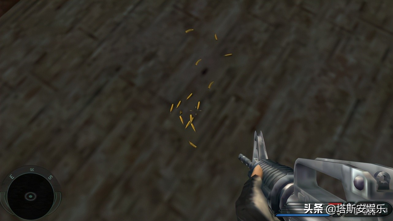然后是游戏的建模细节,当武器开火时,低下头能看到弹壳落在地上,虽然贴图表现得很模糊,但也体现出真实的细节,只是当时的游戏引擎比较有限。