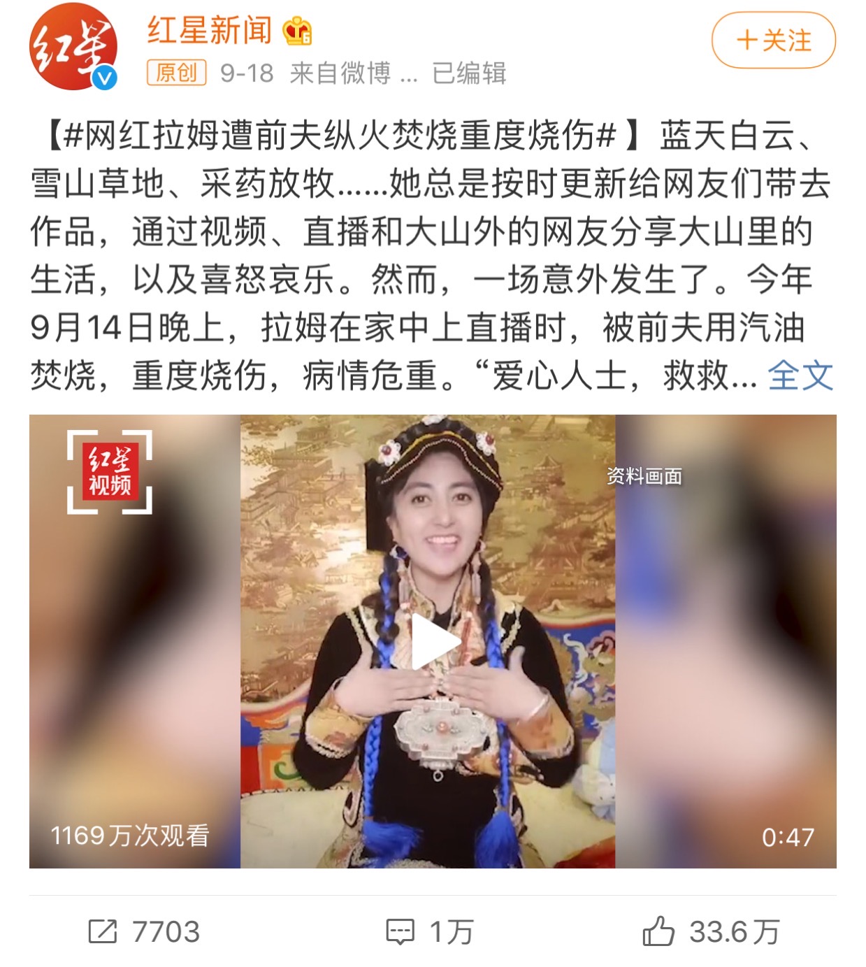 2020年9月14日,四川省阿坝州的藏族姑娘拉姆在家中被前夫唐某泼洒汽油后点燃,致使身体85%以上的皮肤被烧伤,半个月后,她经救治无效去世。