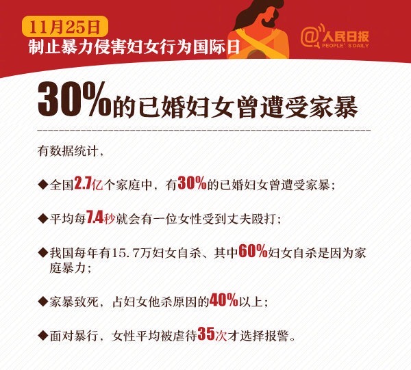 一是在中国2.7亿的家庭中,有30%的女性遭遇过家暴。