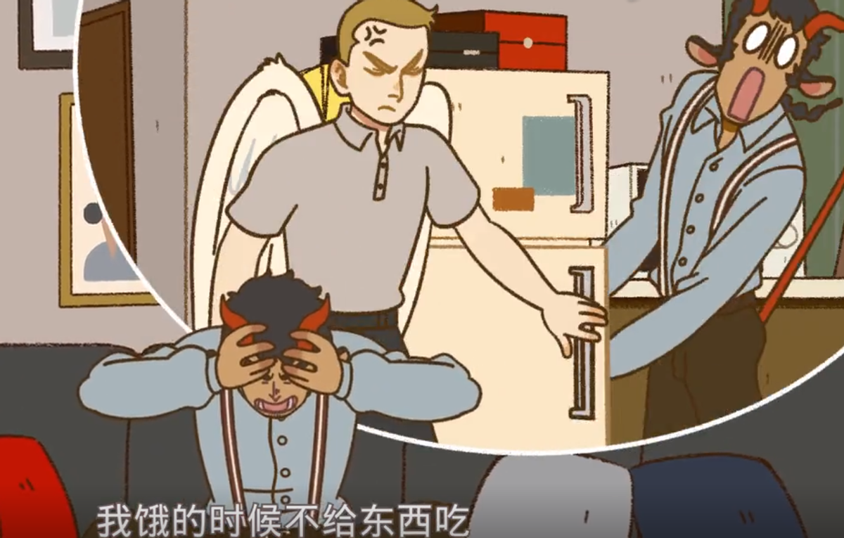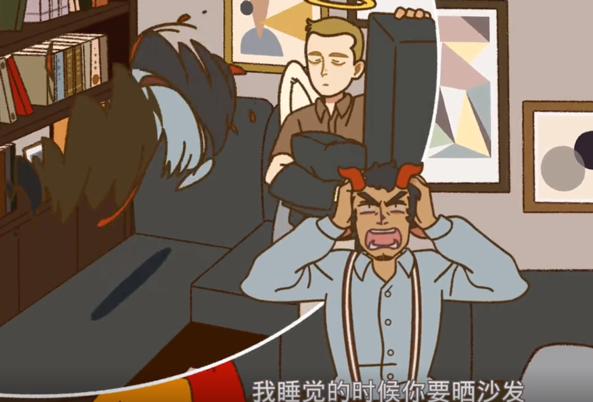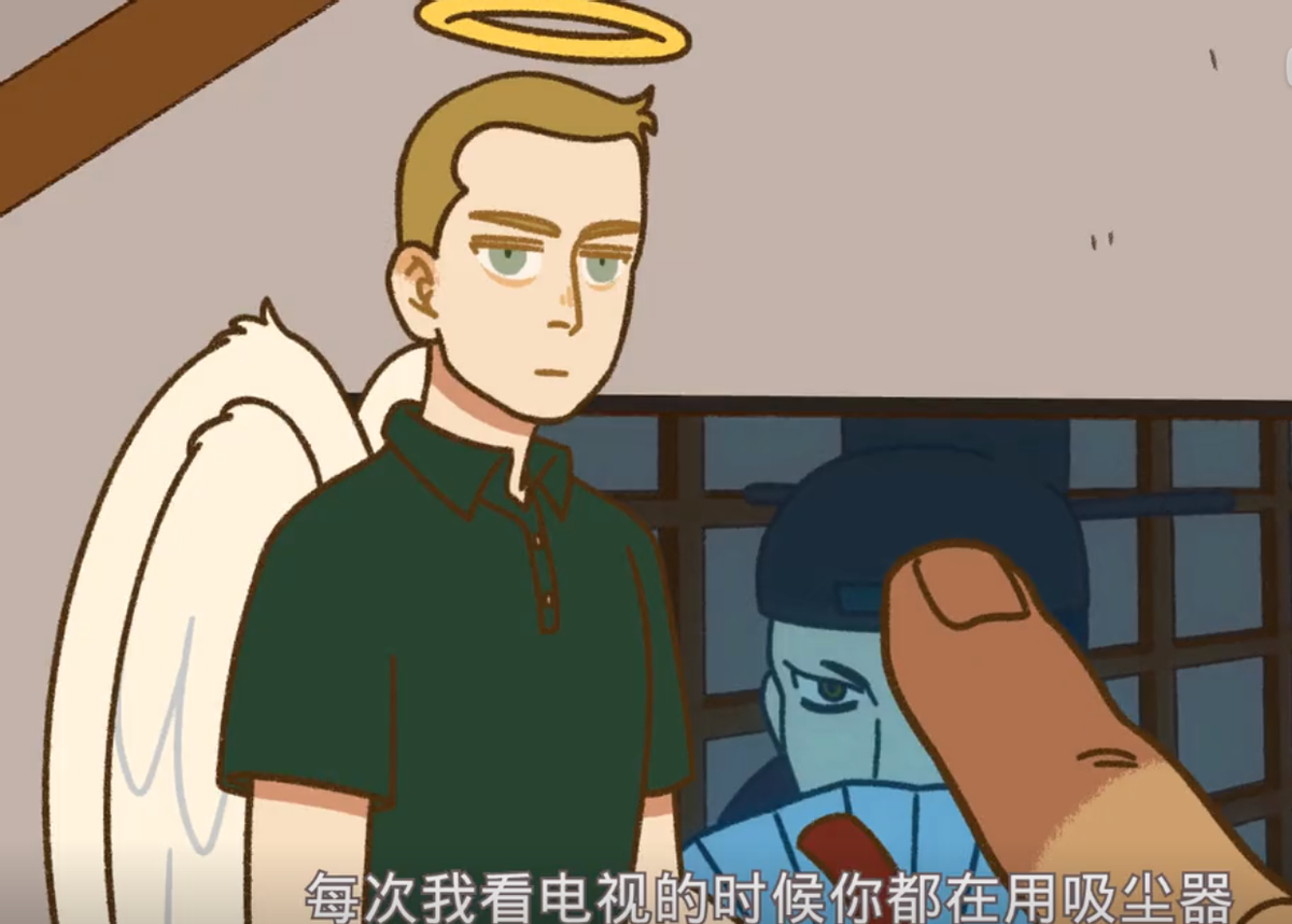 发出哀嚎的男人正是来自地狱的年度优秀员工恶魔尼克,而让这个男人崩溃的罪魁祸首,正一脸无辜地站在电视机前,他便是来自天堂的模范教师林恩!