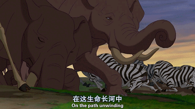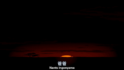 而电影开篇的主题曲《circle of life》则颇有创意的以非洲土著祖鲁语唱喊开始,声音豪放嘹亮,由低缓逐渐上升,配合画面里慢慢升起的太阳,将我们带入了辽阔神秘的非洲草原。