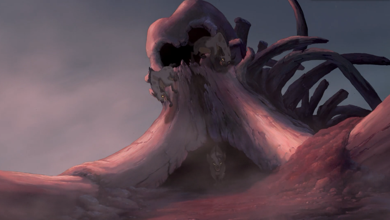 而整部电影,在刀疤统治时期,和木法沙时代万物昌盛的景观不同,处处透着大象墓园的死亡气质,枯萎,凋敝,甚至天空难见阳光,密布的乌云中夹着闪电。